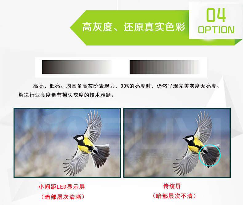 1、P1.388全彩顯示屏采用四燈合一HD LED封裝技術(集成SMD+COB優點),該技術解決墨色一致性、拼接縫、漏光、維修等問題,同時具備高對比度、高集成、易維護、耐撞擊、防串光等特點。